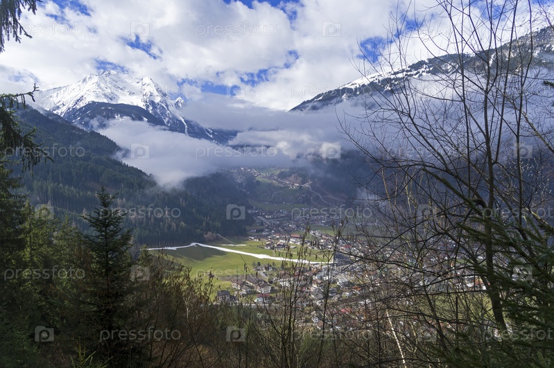 Вид с горного склона на горнолыжный курорт Майрхофен. Тироль, Австрийские Альпы