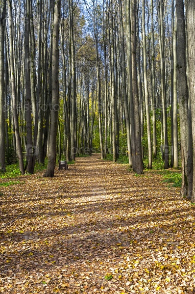Дорожка в осеннем лесу, засыпанная опавшими листьями. Солнечный день в конце октября. Москва, Битцевский парк, Узкое