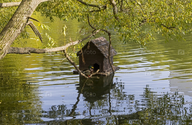 Селезень утки-кряквы сидит на ветке рядом с утиным домиком на поверхности пруда. Солнечный день в начале октября
