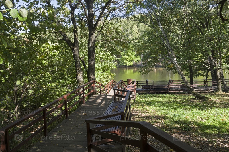 Благоустроенная пешеходная дорожка, ведущая к берегу пруда. Солнечный день в сентябре. Ландшафтный заказник Теплый Стан, Москва, Россия,