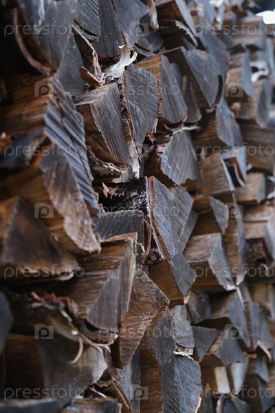 Дрова, приготовленные на зиму под дождем, мокрые бревна на улице сложены друг на друга, выборочный фокус