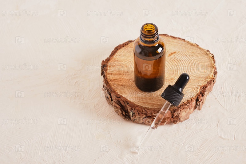 Коричневая стеклянная бутылка с пипеткой на спиле дерева на бежевом текстурированном фоне