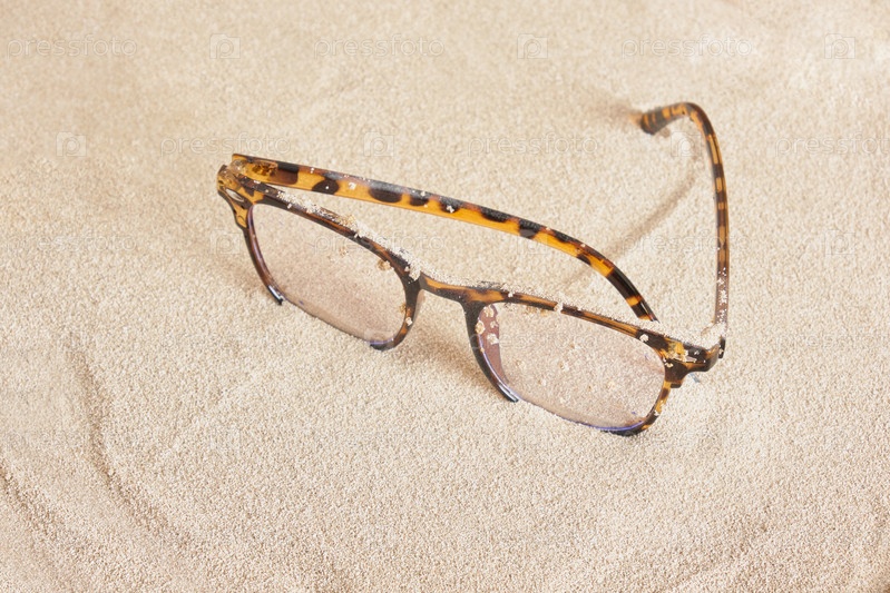 Стильные очки с пятнистыми пластиковыми оправами на песке, пространство для копирования