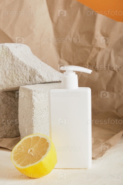 Белая пластиковая бутылка с дозировщиком для мыла и крема, лимонные и бетонные подиумы, коричневый фон, листовая бумага, макет косметики