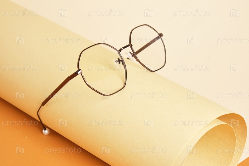 Модные очки на рулонной бежевой бумаге, геометрический фон, трендовые цвета, пространство для копирования на желтом фоне