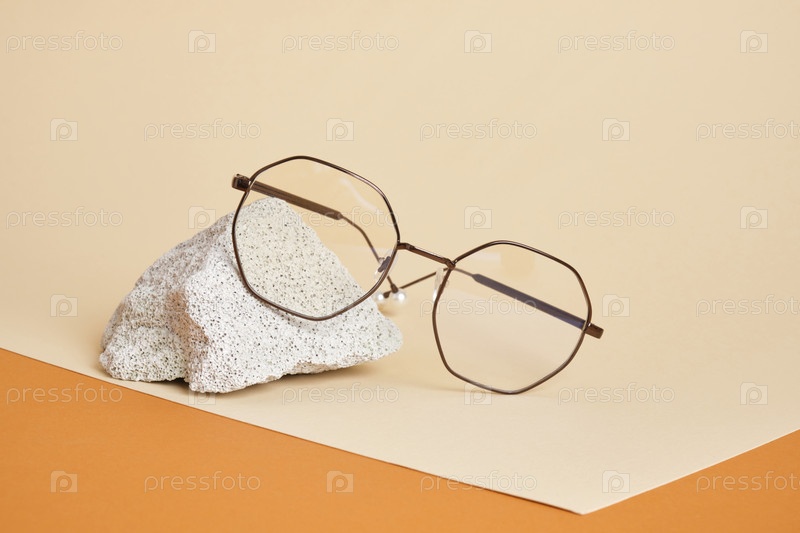Очки и кусок кирпича на бежевом фоне, трендовая композиция, стильные очки для копирования пространства