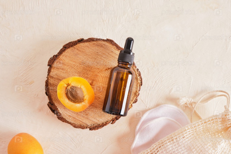 Абрикосы и стеклянная коричневая бутылка с капельницей для косметики на бежевом фоне