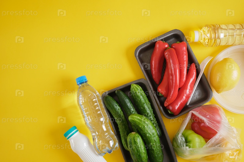 Набор продуктов в различной пластиковой упаковке, концепция загрязнения окружающей среды пластиком, скажи нет пластику
