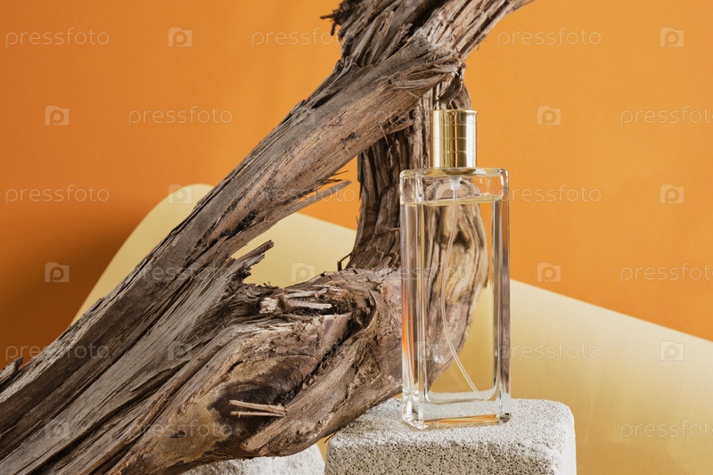 Стеклянный флакон духов в корягах, естественный оттенок фона