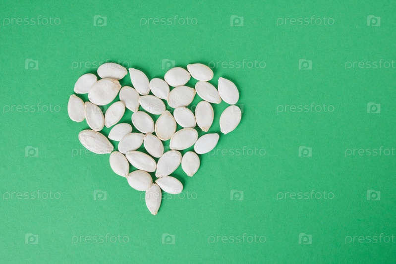 Форма сердца из тыквенных семечек на зеленом фоне