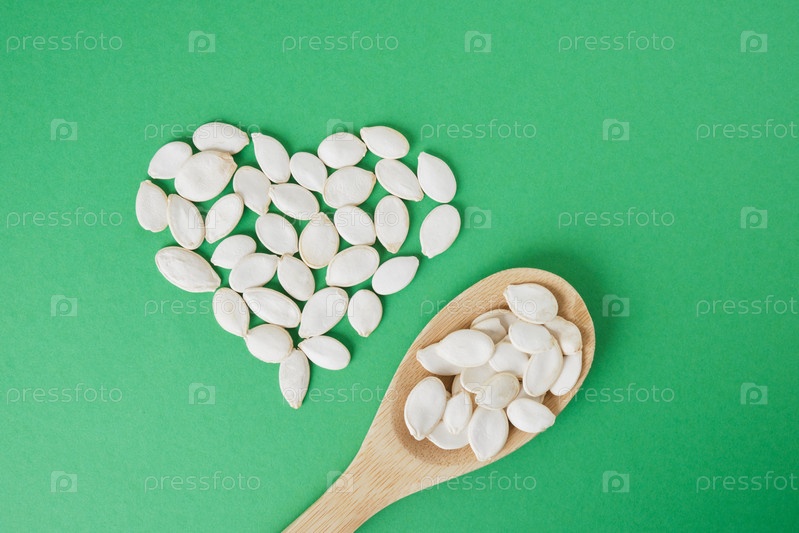 Форма сердца из тыквенных семечек на зеленом фоне
