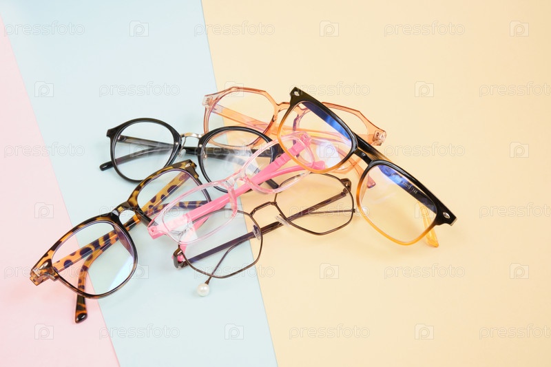 Несколько модных модных очков для коррекции зрения на красочном фоне, геометрический фон из пастельной бумаги