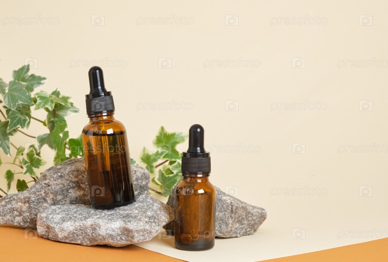 Коричневые бутылки для косметики с пипеткой на бежевом фоне, камни и растение на заднем плане, концепция образа жизни без отходов