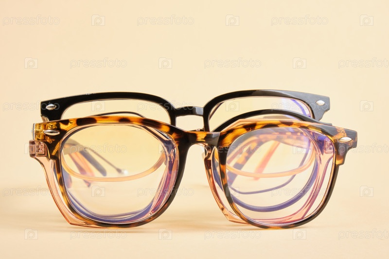 Несколько модных модных очков для коррекции зрения на красочном фоне, геометрический фон из пастельной бумаги