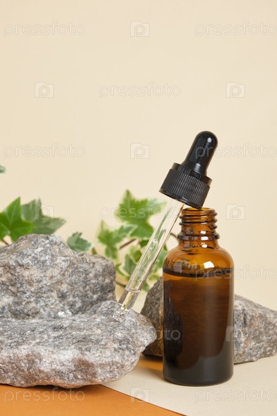 Коричневая бутылка для косметики с пипеткой на бежевом фоне, камни и растение на заднем плане, образ жизни без отходов