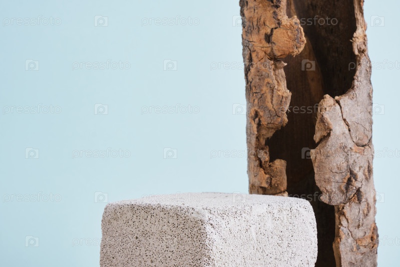Бетонные пустые подиумы и кора дерева на голубом фоне. Макет продуктовых стендов. копировать пространство