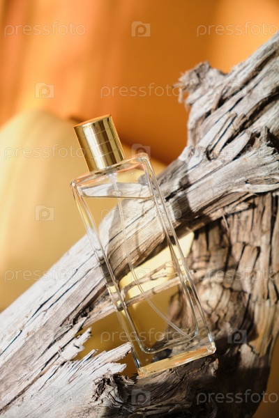 Стеклянный флакон духов на коряге, естественный оттенок фона, духи с древесными нотами