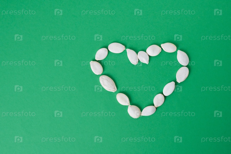Форма сердца из тыквенных семечек на зеленом фоне. копировать космический вид сверху
