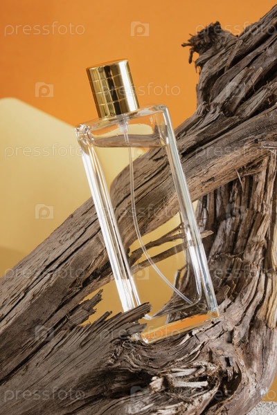 Стеклянный флакон духов на коряге, естественный оттенок фона, духи с древесными нотами