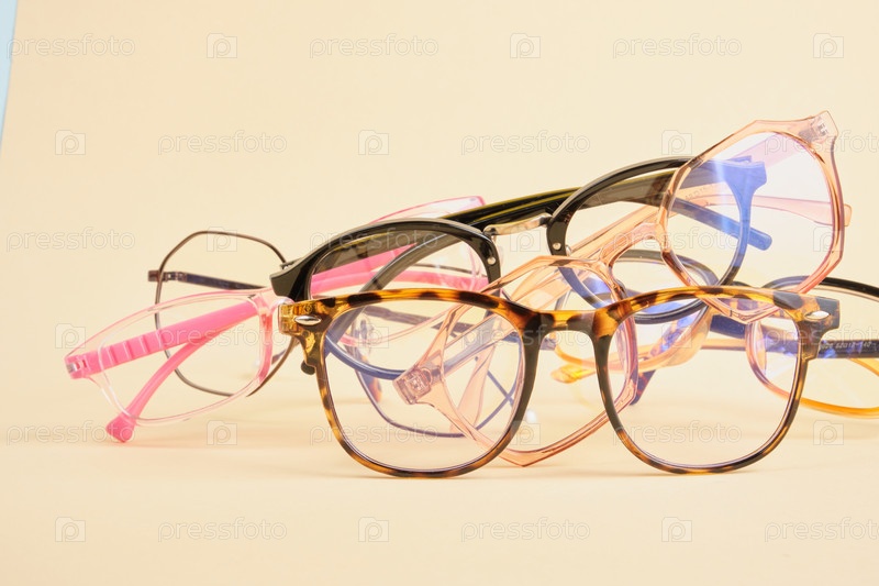 Несколько модных модных очков для коррекции зрения на красочном фоне, геометрический фон из пастельной бумаги