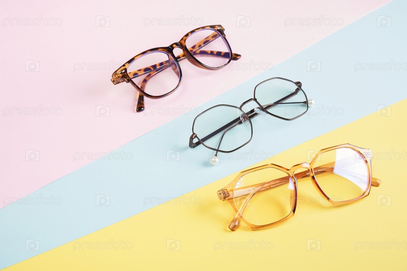 Несколько очков на разноцветном фоне пастельных тонов, геометрический фон, розово-желтый и голубой цвета, модные оправы для очков