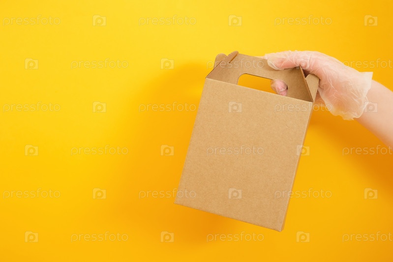 Рука в одноразовой резиновой перчатке держит картонную коробку на желтом фоне, концепция бесконтактной доставки