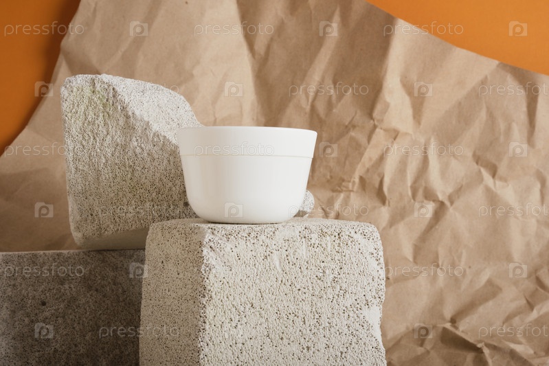 Белая пластиковая банка для крема или скраба на бетонном подиуме на коричневом фоне