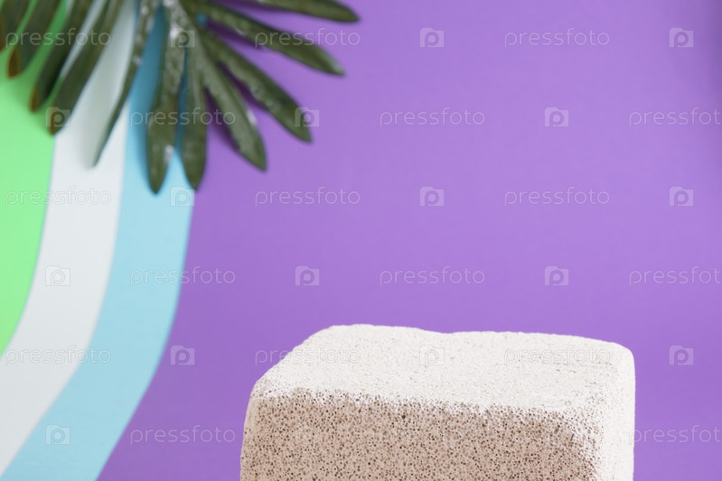 Бетонные пустые подиумы и пальмовые листья на ярком многоцветном фоне. Макет продуктовых стендов