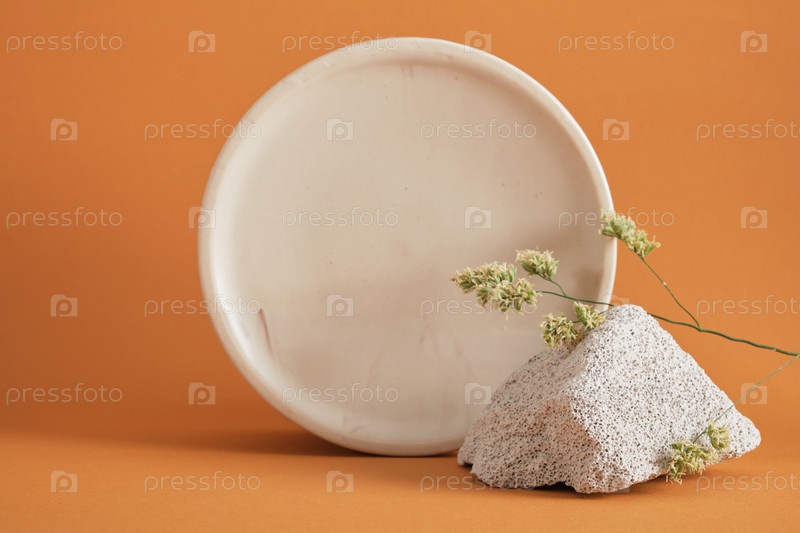 Фрагмент бетонного блока и круглый мраморный подиум, травинка на коричневом фоне, белый макет фона для вашего продукта