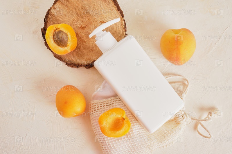 Абрикосы пластиковая белая макетная бутылка с дозатором для крема или мыла, деревянный подиум из пилы, вырезанной из дерева на светлом фоне, вид сверху