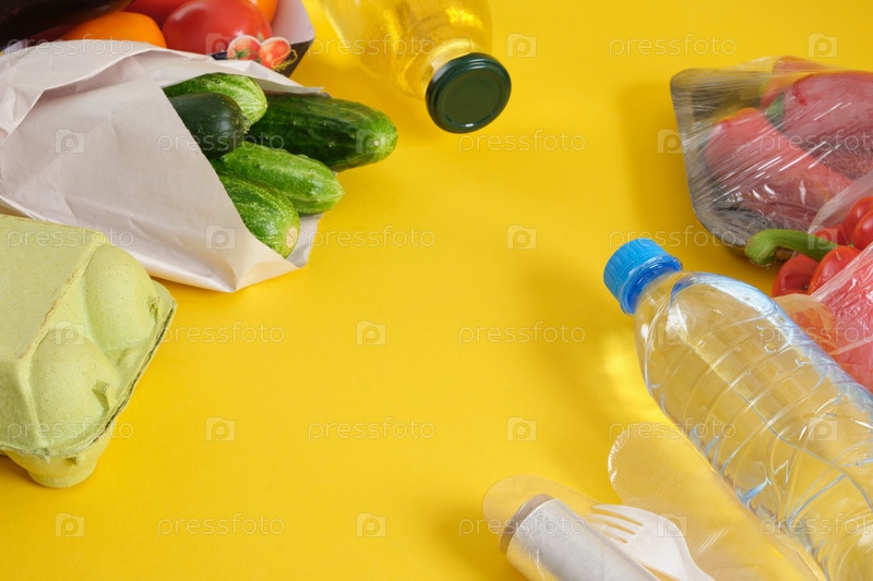 Пластиковая одноразовая упаковка по сравнению с многоразовой, без пластиковой концепции, сетчатого мешка и пластикового продуктового пакета