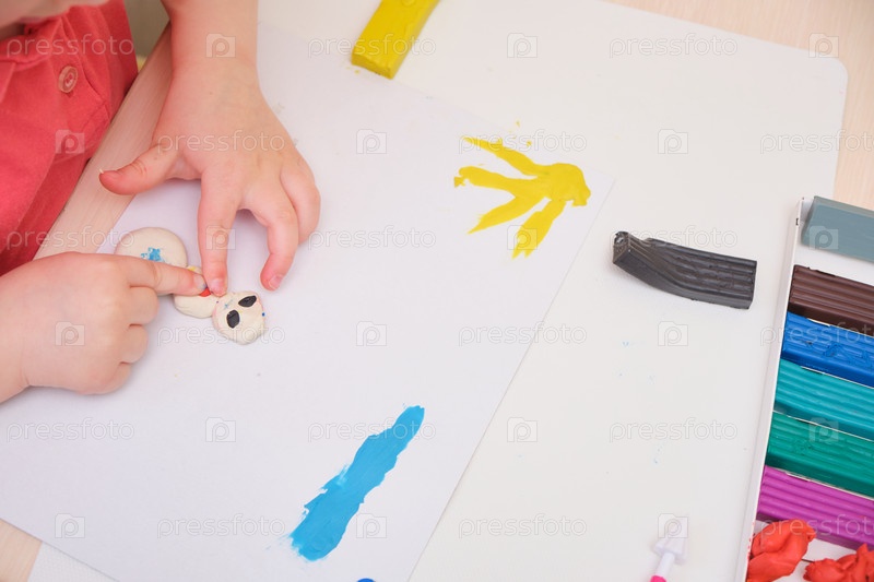 Маленькая девочка играет с красочной глиной для лепки на столе. Главная Развивающая игра с пластилином