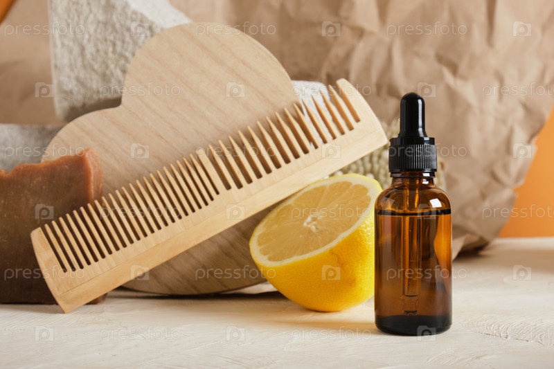 Бутылка из коричневого стекла с капельницей для сыворотки или косметического масла на светлом фоне, экологически чистая концепция ухода за телом, лимон и массажная щетка на заднем плане