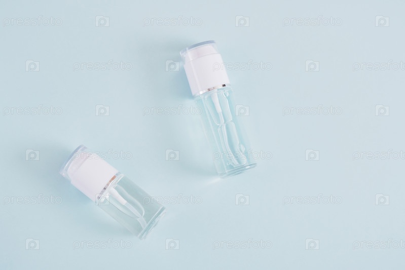 Два макета пустых стеклянных бутылок с белой крышкой на голубом фоне, косметические бутылки, бутылка с гелем и духами