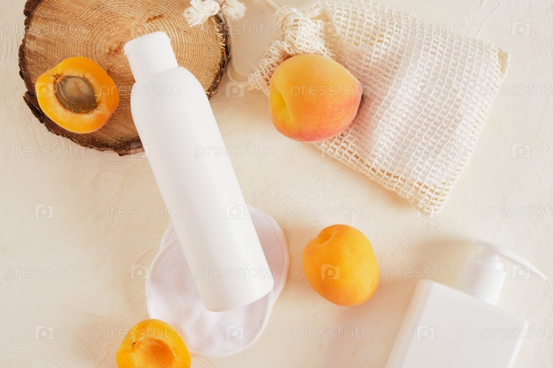 Абрикосы и макет пластиковой белой бутылки для крема или мыла, деревянный подиум из распила дерева на светлом фоне, вид сверху
