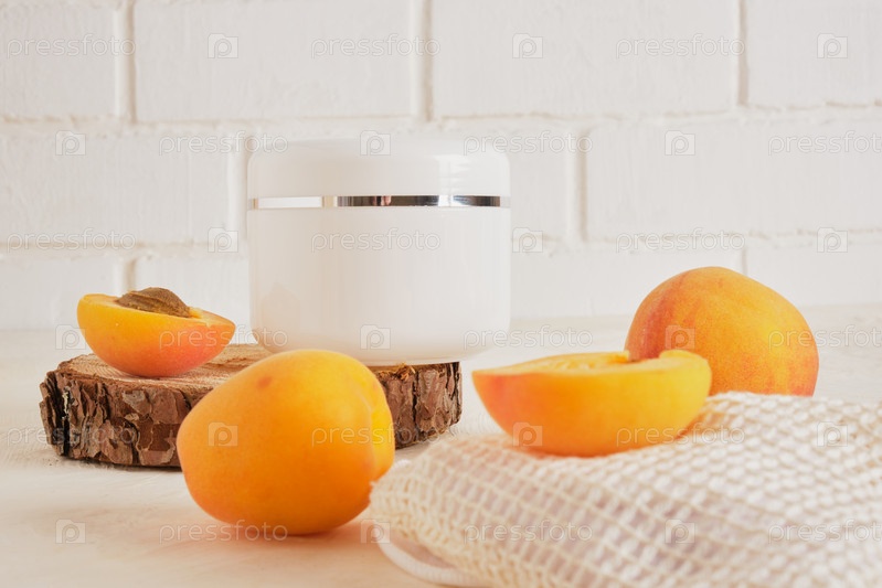 Пластиковая белая банка абрикосов для крема или косметики на деревянном подиуме из спила дерева на светлом фоне, на фоне стены из белого кирпича