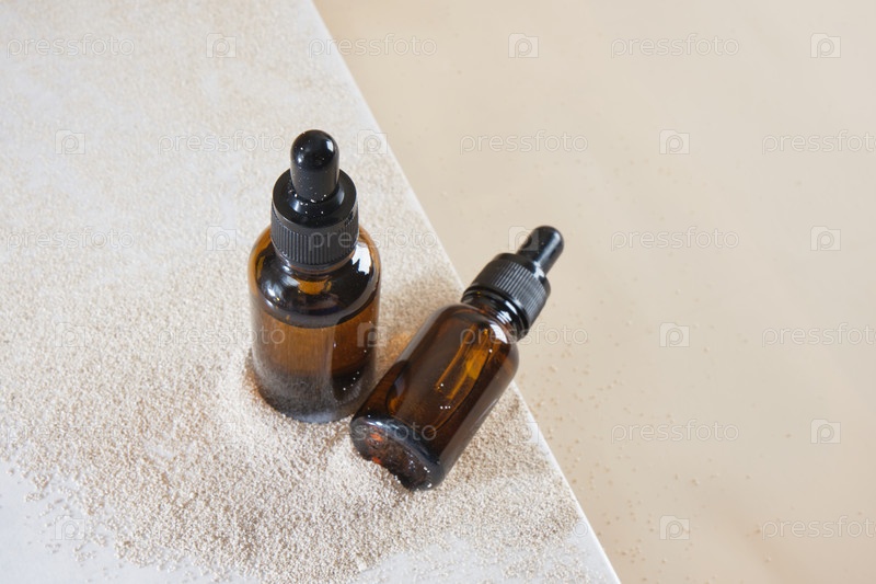 Бутылки из коричневого стекла с пипеткой на естественном фоне с песком. натуральное масло для ухода за кожей тела. Копировать пространство