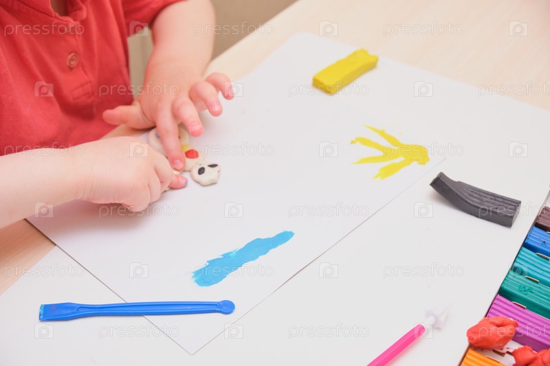 Маленькая девочка играет с красочной глиной для лепки на столе. Главная Развивающая игра с пластилином