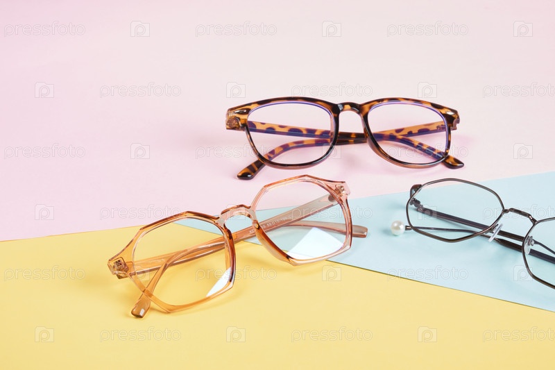 Несколько очков на разноцветном фоне пастельных тонов, геометрический фон, розово-желтый и голубой цвета, модные оправы для очков