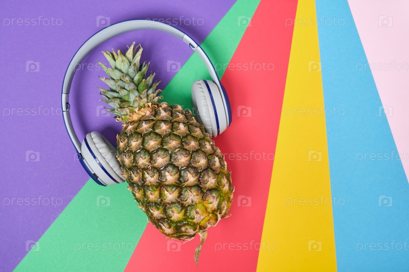 Ананас в беспроводных наушниках на цветном ярком фоне копией пространства