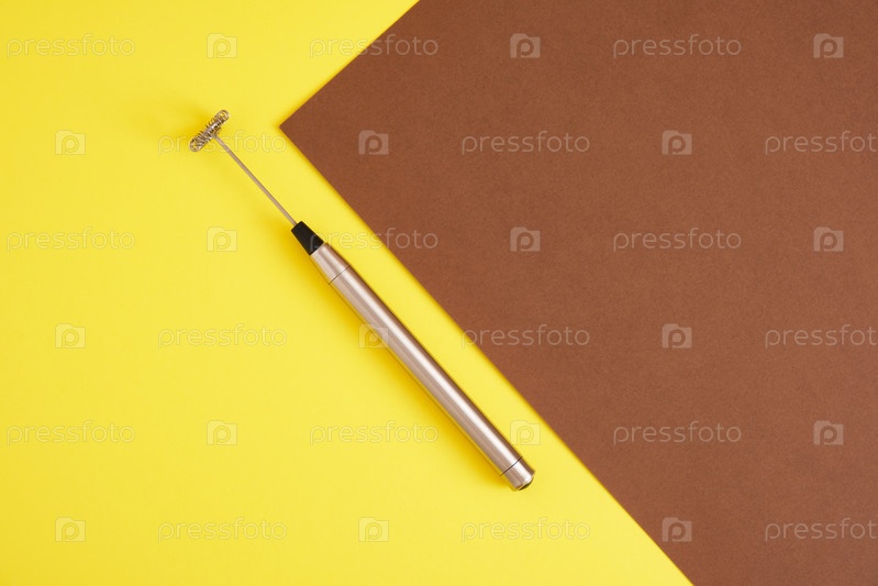 Металлический ручной взбиватель для молока на желтом и коричневом фоне. Ручной пенообразователь крупным планом
