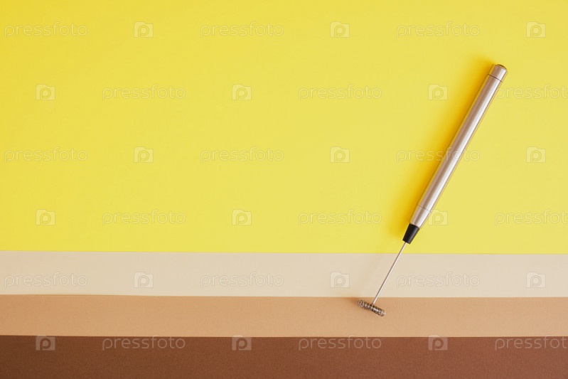 Металлический ручной взбиватель для молока на бежевом желтом и коричневом фоне. Ручной пенообразователь крупным планом