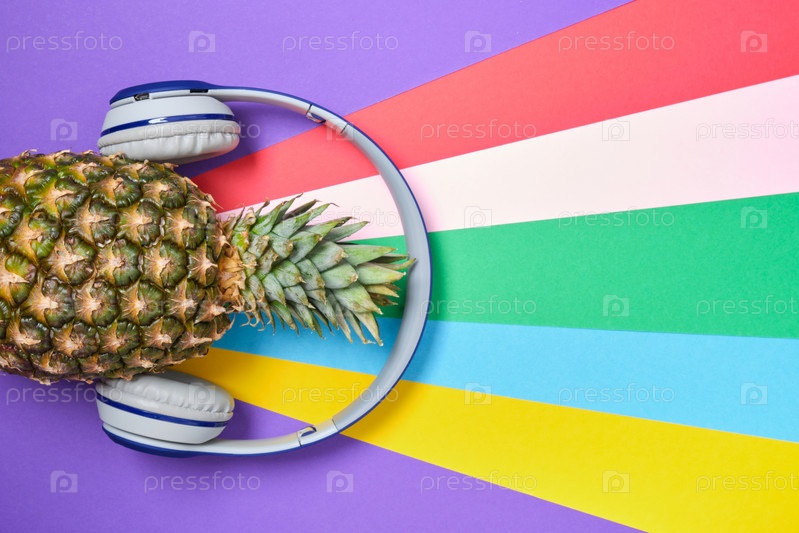 Ананас в беспроводных наушниках на цветном ярком фоне копией пространства