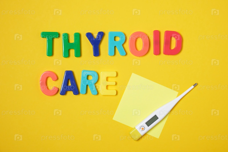 Надпись уход за щитовидной железой на желтом фоне вид сверху копией пространства