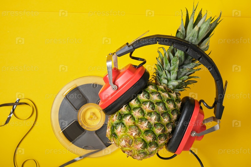 Катушка с магнитной аудиолентой и ананас в красных ретро-наушниках на желтом фоне, концепция меломана