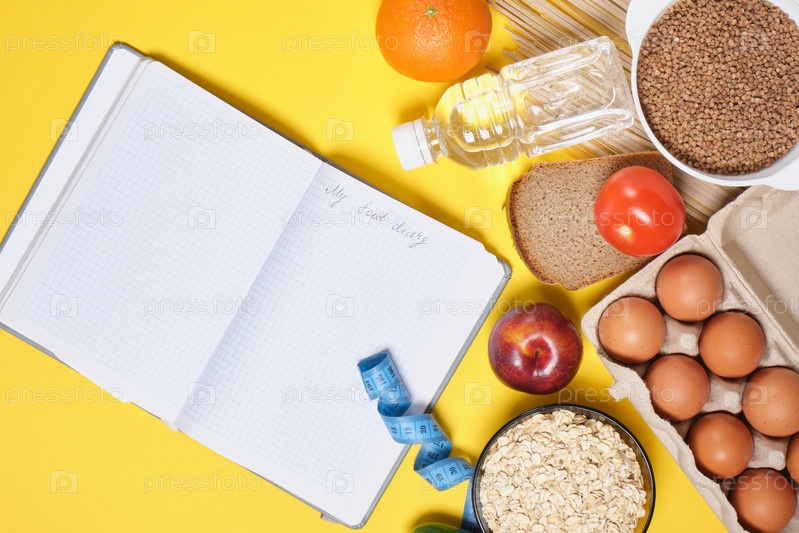 Планирование диеты Блокнот и диетическое питание на желтом фоне
