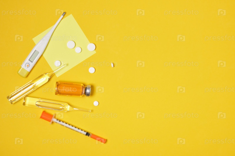 Таблетки, электронный термометр, ампулы с лекарствами и шприц на желтом фоне копией пространства вид сверху