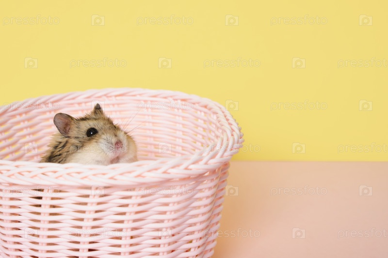 Хомяк в розовой корзинке на желтом фоне