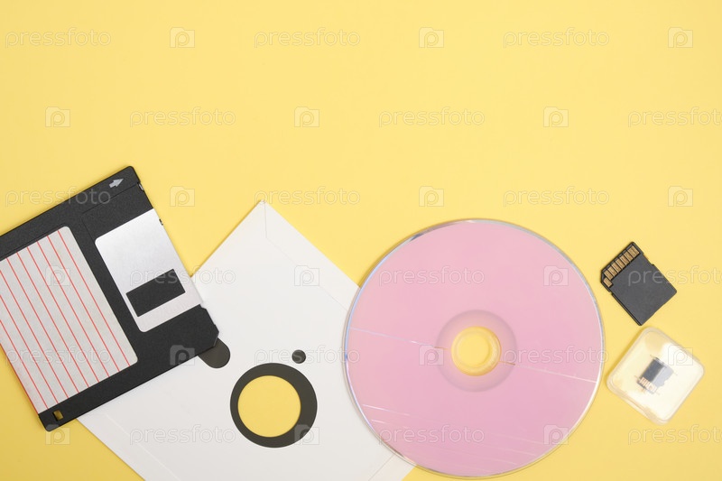 Различные виды дисков для хранения информации на желтом фоне, современные и ретро диски и дискеты
