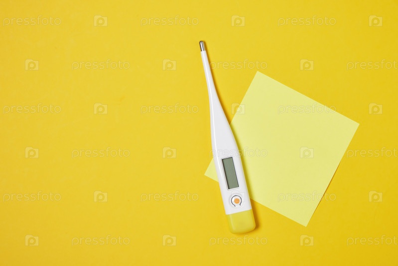 Электронный термометр на желтом фоне копией пространства вид сверху